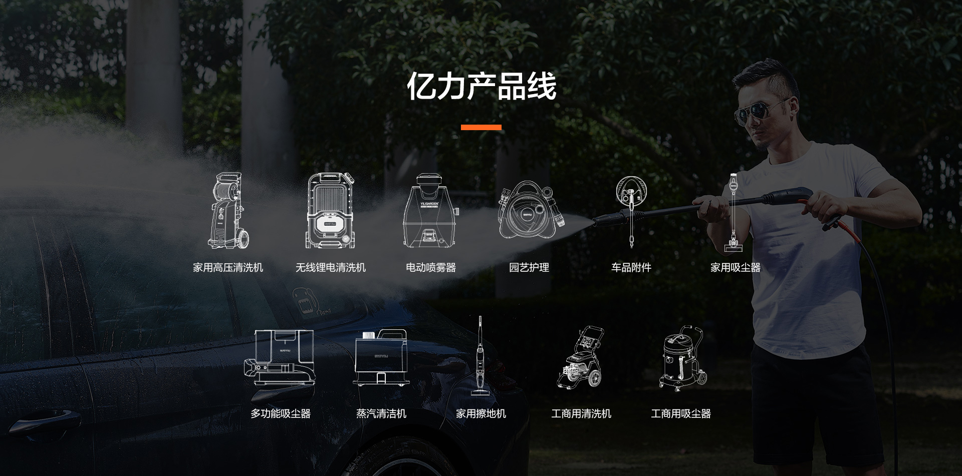 億力主要從事高壓清洗機、吸塵器、噴霧器、蒸汽清潔機等多元化清潔類產品的研發、生產、營銷,旗下擁有“億力”、“艾主人”、“YILIGARDEN”等多個品牌。